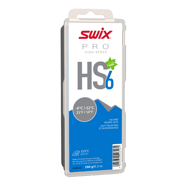 HS6 Swix Ski Snowboard Glide Wax HS06-6 60g. Replaces the Swix LF wax series. The HS series are great gliders for training and competition and can be used as a race wax alone or as a base for top coats. HS6 is very versatile. Its area of use stretches from base for powder overlays, to racing wax, and base prep wax for cold skis. Fantastic all-round glider. Great performance and durability. Fluoro-free and non-toxic. Well tested on many conditions. -6 C / +21 F to -12 C / +10 F HS6 has a good durability and offers great performance on natural and artificial snow. Scraping after approximately one minute. The wax can be re-heated after cooling to room temperature (10 min) for better durability. Recommended iron temp: 145C (293F) Sold in retail container.
